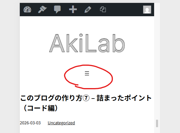 ブロックテーマでは、モバイル表示になるとナビゲーションがハンバーガーメニューに切り替わります。